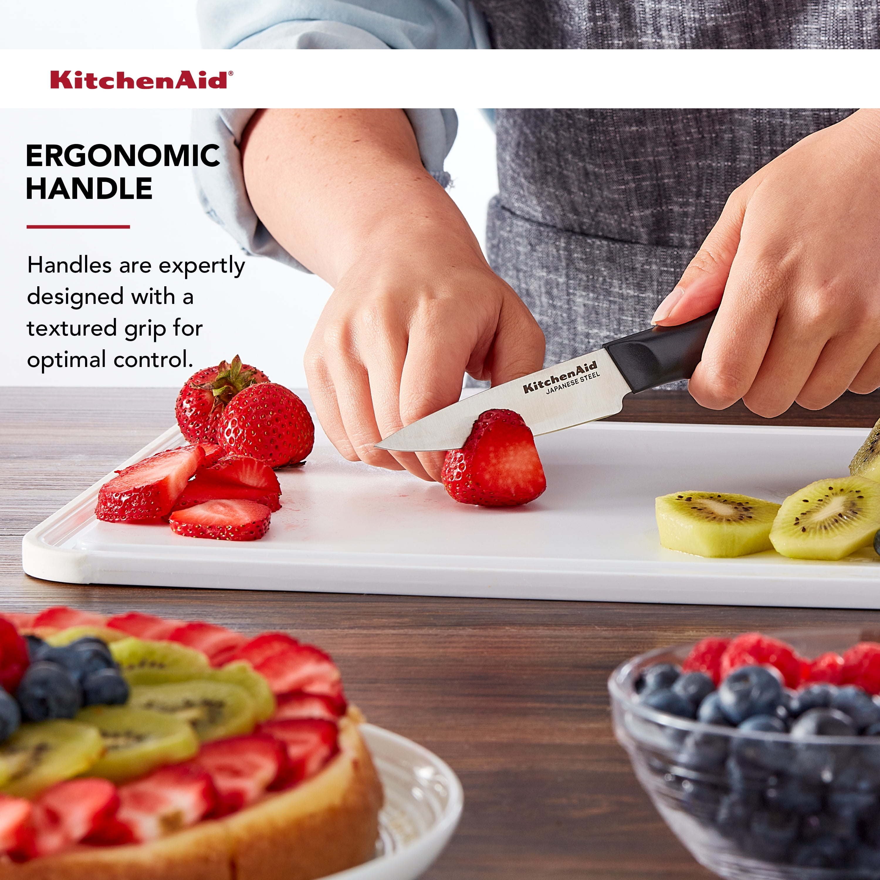 CUTLERY ESSENTIALS: The set includes an 8-inch chef knife, 8-inch slicing knife, 5.5-inch serrated utility knife, 4.5-inch fine edge utility knife, 3.5-inch serrated paring knife, four 4.5-inch steak knives, all-purpose shear and wood storage block with built-in sharpener. PREMIUM MATERIALS: Blades are expertly crafted using semi-polished, high-carbon imported Japanese steel, hardened and tempered to provide a long-lasting edge for a professional, quality cut every time ERGONOMIC HANDLE: Eastern-style ergonomic handles provide optimal control for everyday use. They are expertly engineered with a textured finish for a comfortable grip and accented with a chrome endcap. BUILT-IN KNIFE SHARPENER: The convenient built-in sharpener helps ensure knives maintain their sharp blade and superior performance. USE AND CARE: Knives are top-rack dishwasher safe for effortless clean up. To extend the life of your cutlery, hand washing is recommended. Dry immediately. Classic 12-Piece Knife Block Set with Built-in Knife Sharpener, Black: KE12STENBXOBW