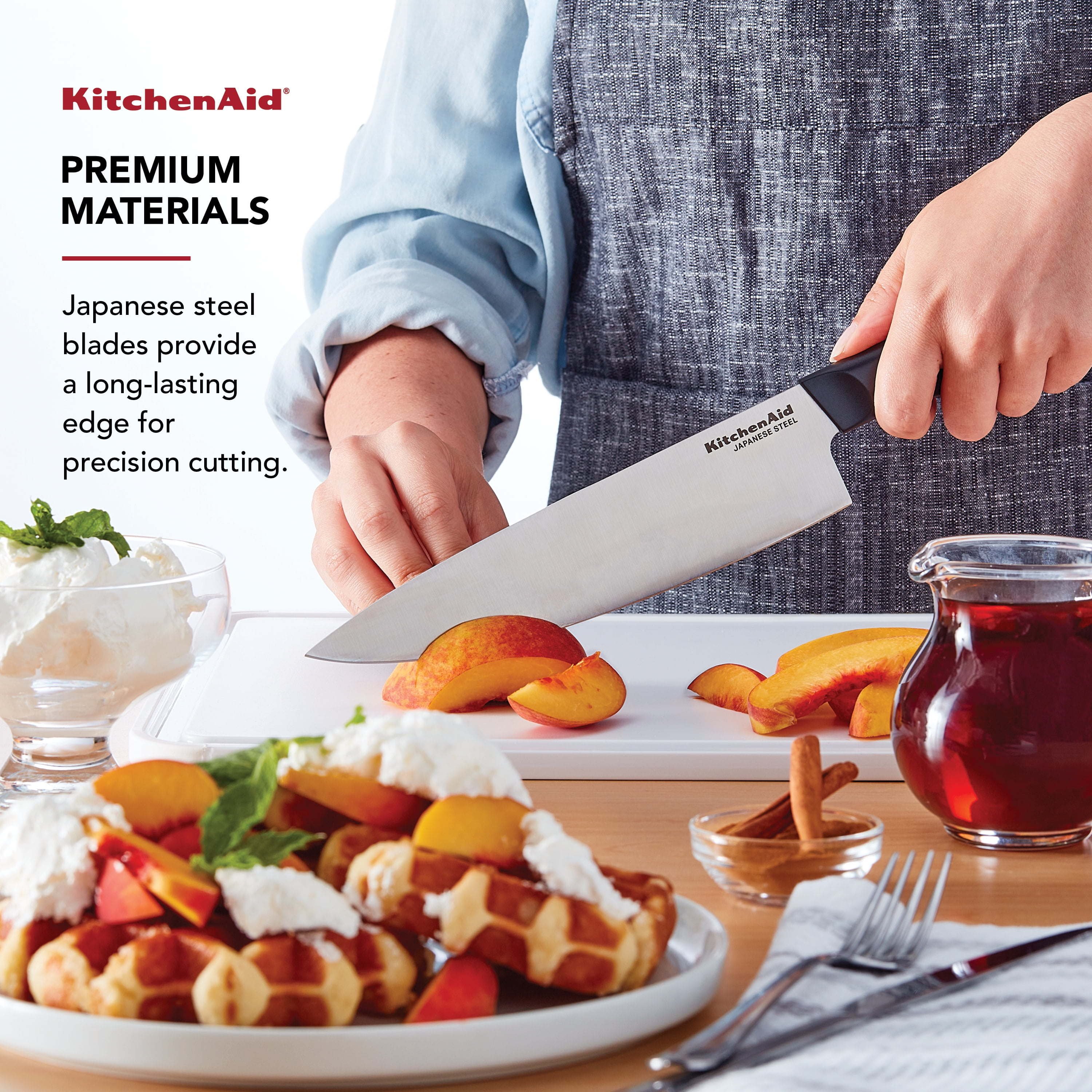This Classic 12-piece knife block set includes all the essential knives needed to perform everyday food prep tasks such as slicing, cutting, chopping, mincing, trimming, and more. The set includes an 8-inch chef knife, an 8-inch slicing knife, a 5.5-inch serrated utility knife, a 4.5-inch fine-edge utility knife, a 3.5-inch fine-edge paring knife, a 3.5-inch serrated paring knife, four 4.5-inch steak knives, all-purpose shear, and wood storage block with a built-in sharpener. Blades are expertly crafted using semi-polished, high-carbon Japanese steel, hardened and tempered to provide a long-lasting edge for a professional, quality cut every time. These knives feature Eastern-style ergonomic handles that provide optimal control for everyday use. Handles are expertly engineered with a textured finish for a comfortable grip and accented with a chrome endcap. The contemporaryrubberwood storage block features a built-in sharpener for effortless sharpening and complements any kitchen. knives are top-rack dishwasher safe. To extend the life of your cutlery, hand washing is recommended. Dry immediately.
